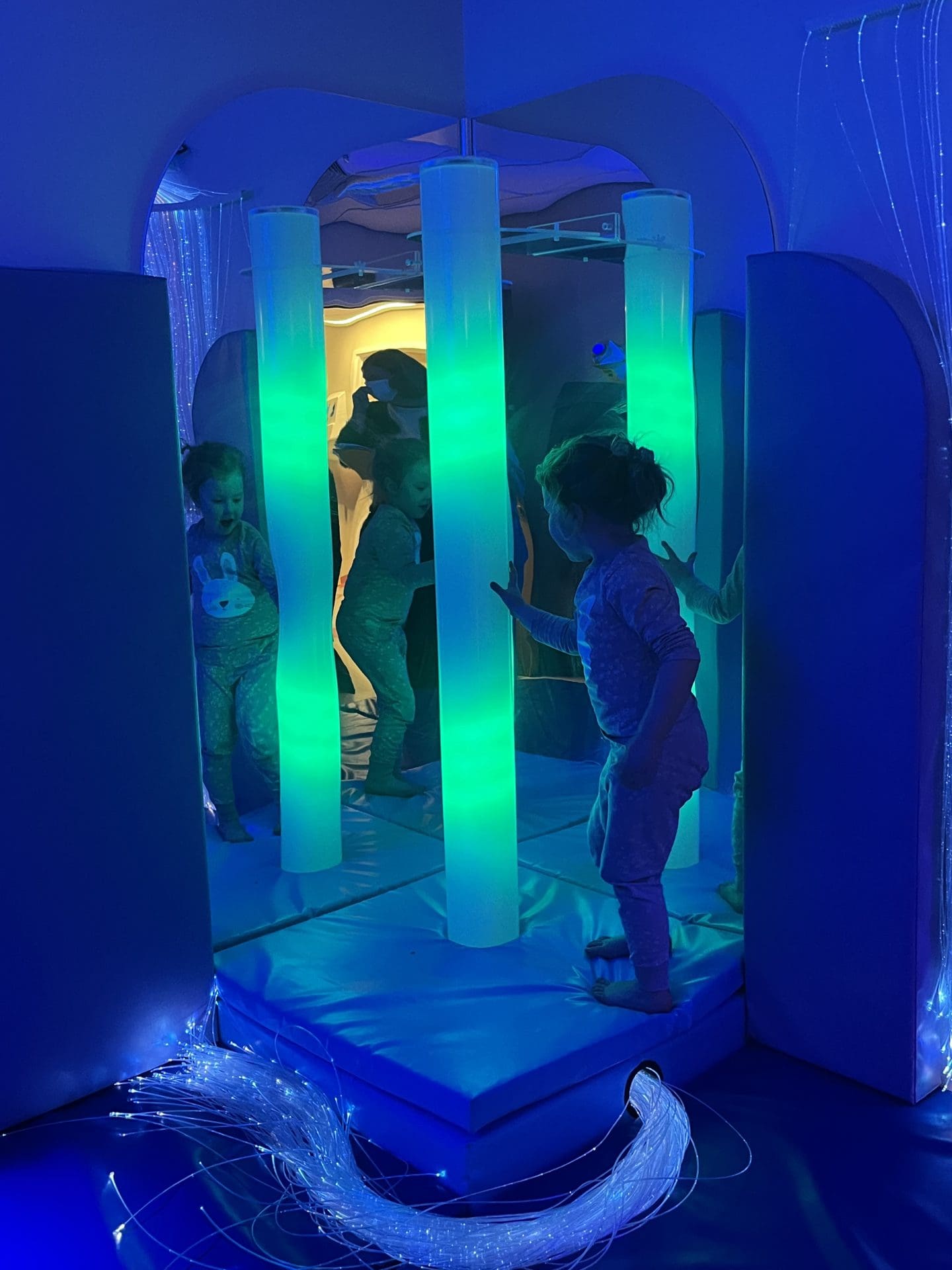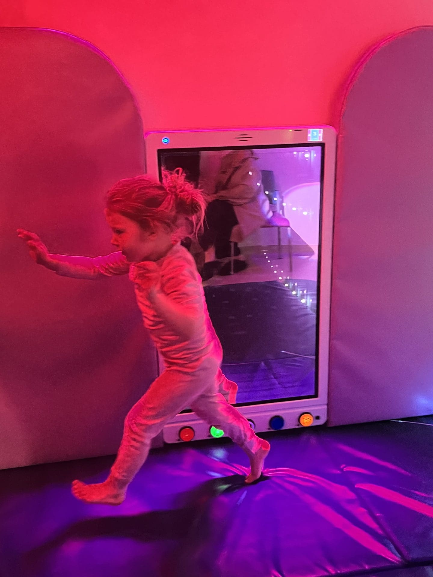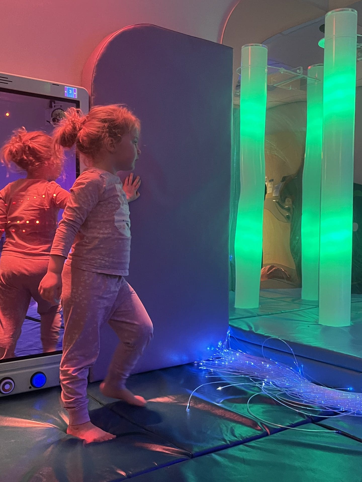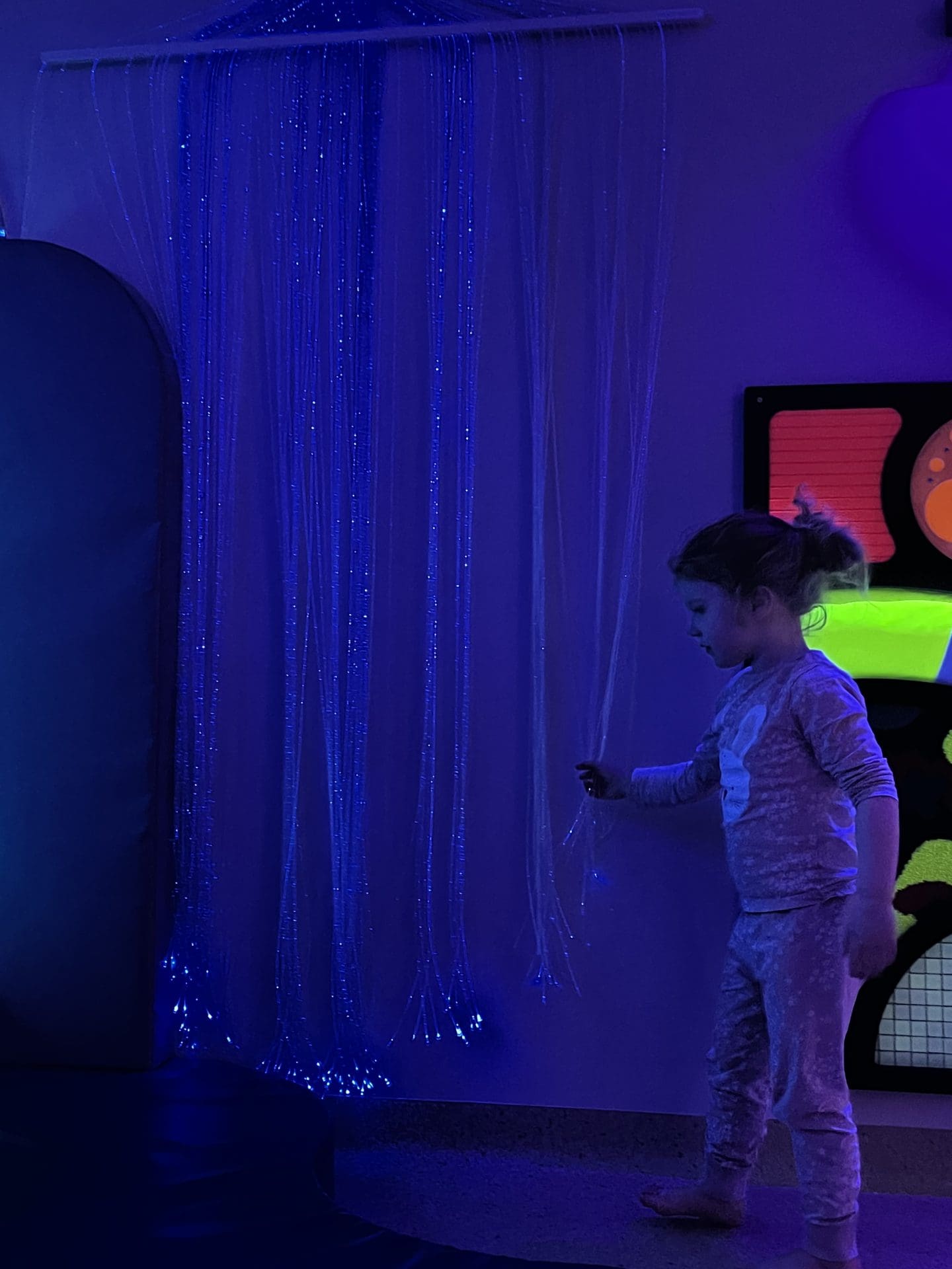 We recently met 3-year-old Georgie, who was enjoying the room while recovering from a chest infection. Georgie experiences low oxygen levels and relies on inhalers, so outdoor play can be challenging—but the sensory room gives her a comfortable space to explore and develop at her own pace.